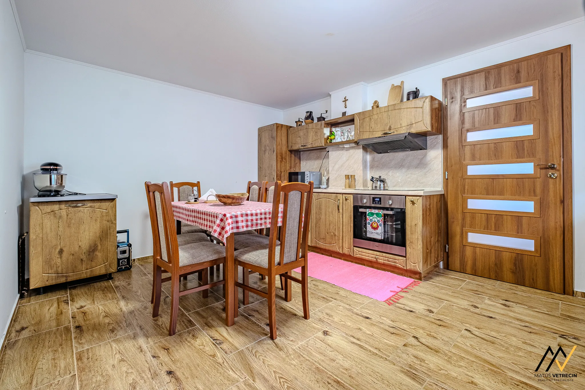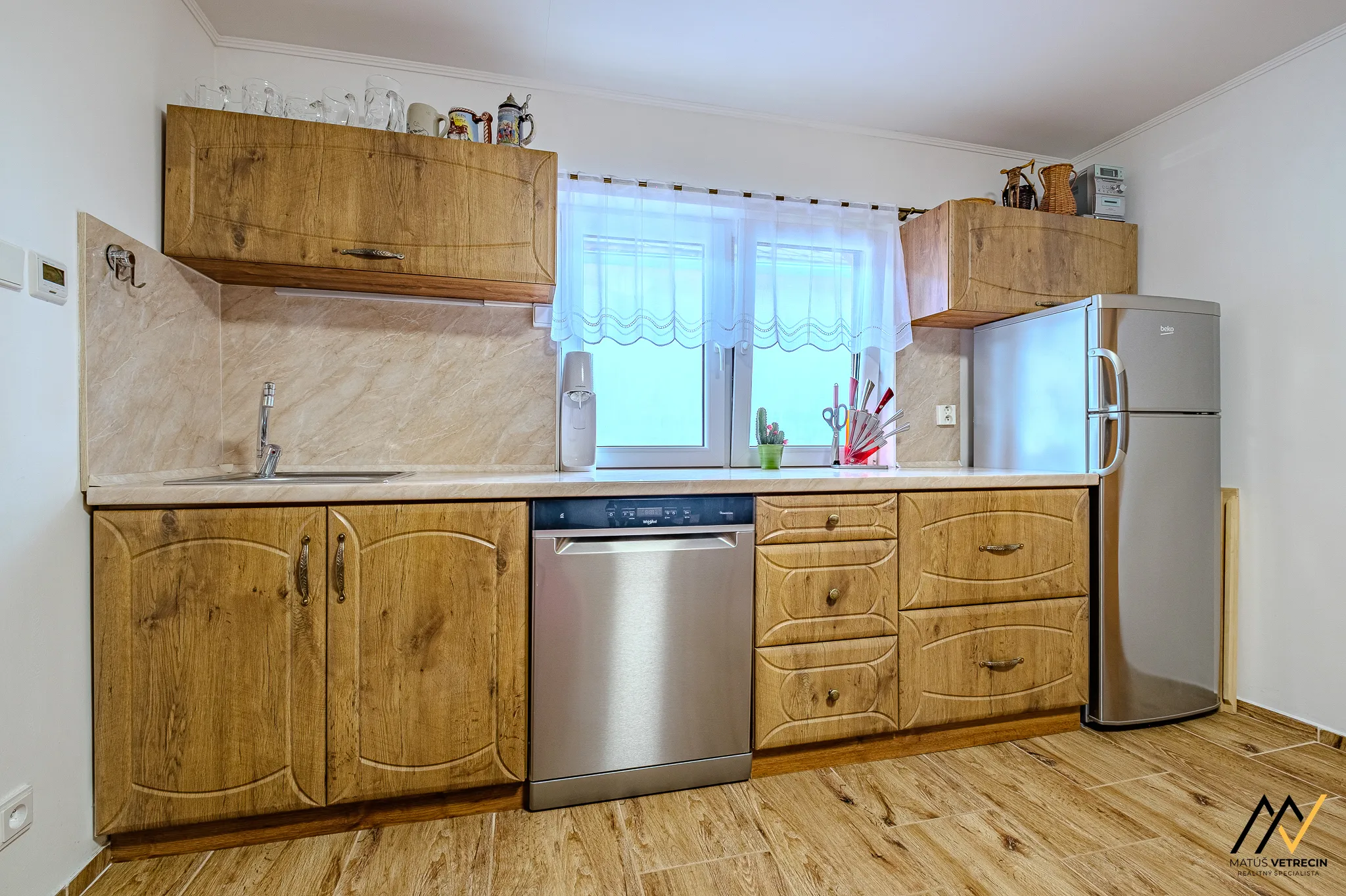 Kuchyňa sa nachádza sa len o pár krokov ďalej, má úplne iný, pokojnejší rytmus. Predstavte si ráno pred ôsmou, ticho, bosé nohy na príjemne teplej podlahe a dotyk mramorovej pracovnej dosky, kým v kanvici začína vrieť voda. Drevené skrinky a citlivé detaily robia z tohto miesta viac než len priestor na varenie – je to štartovacia stanica vášho dňa, ktorá sa prispôsobí vášmu tempu, či už sa ponáhľate do práce, alebo si užívate pomalú nedeľu.