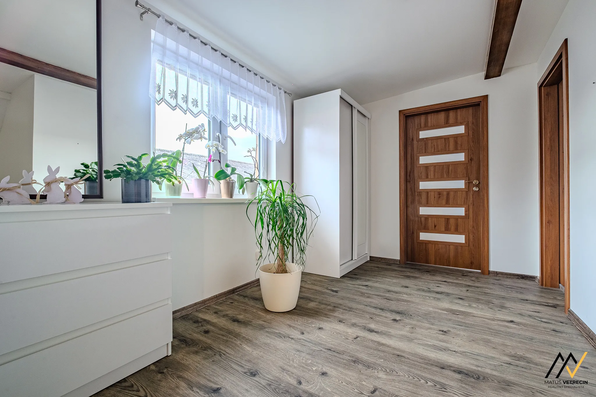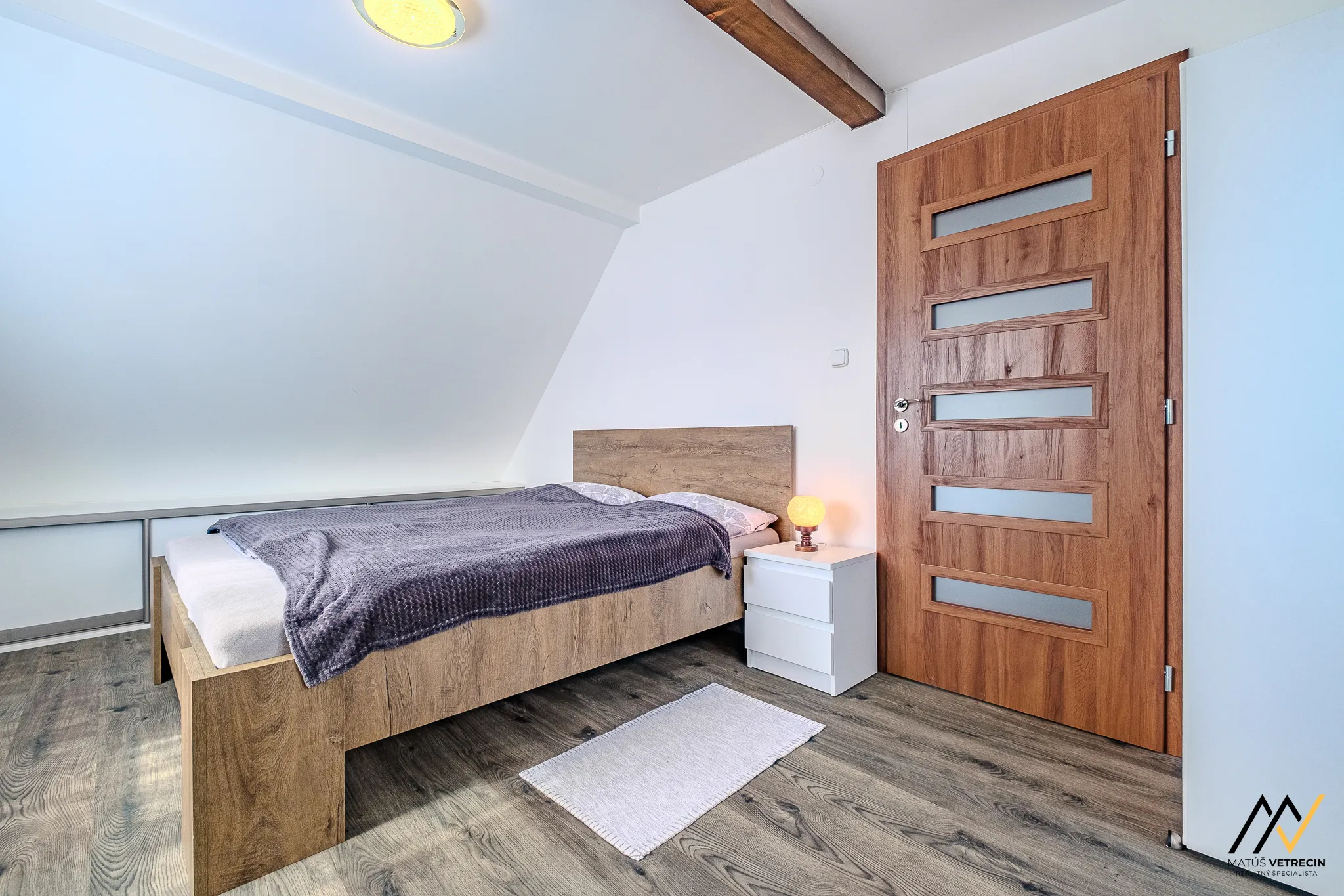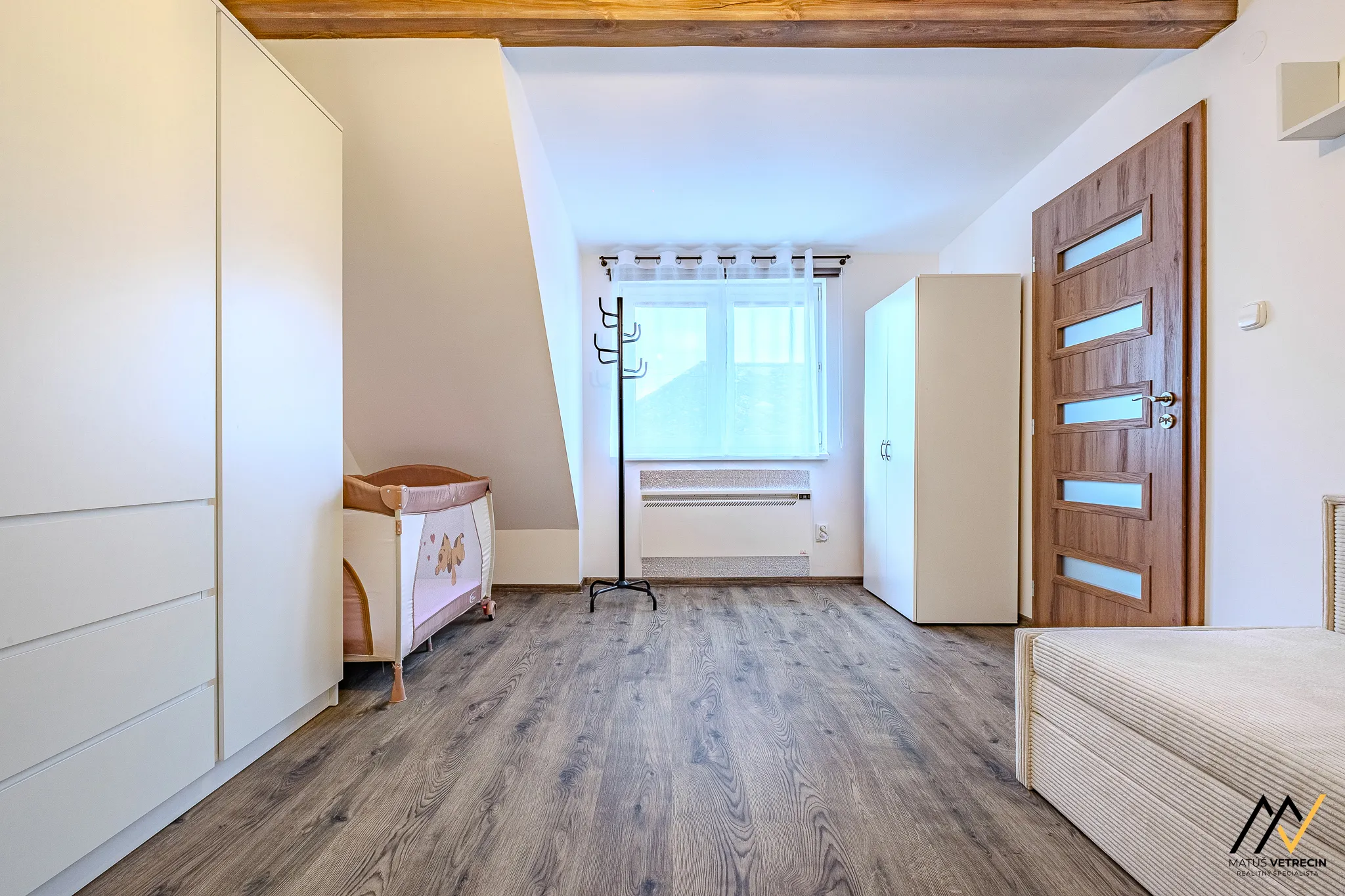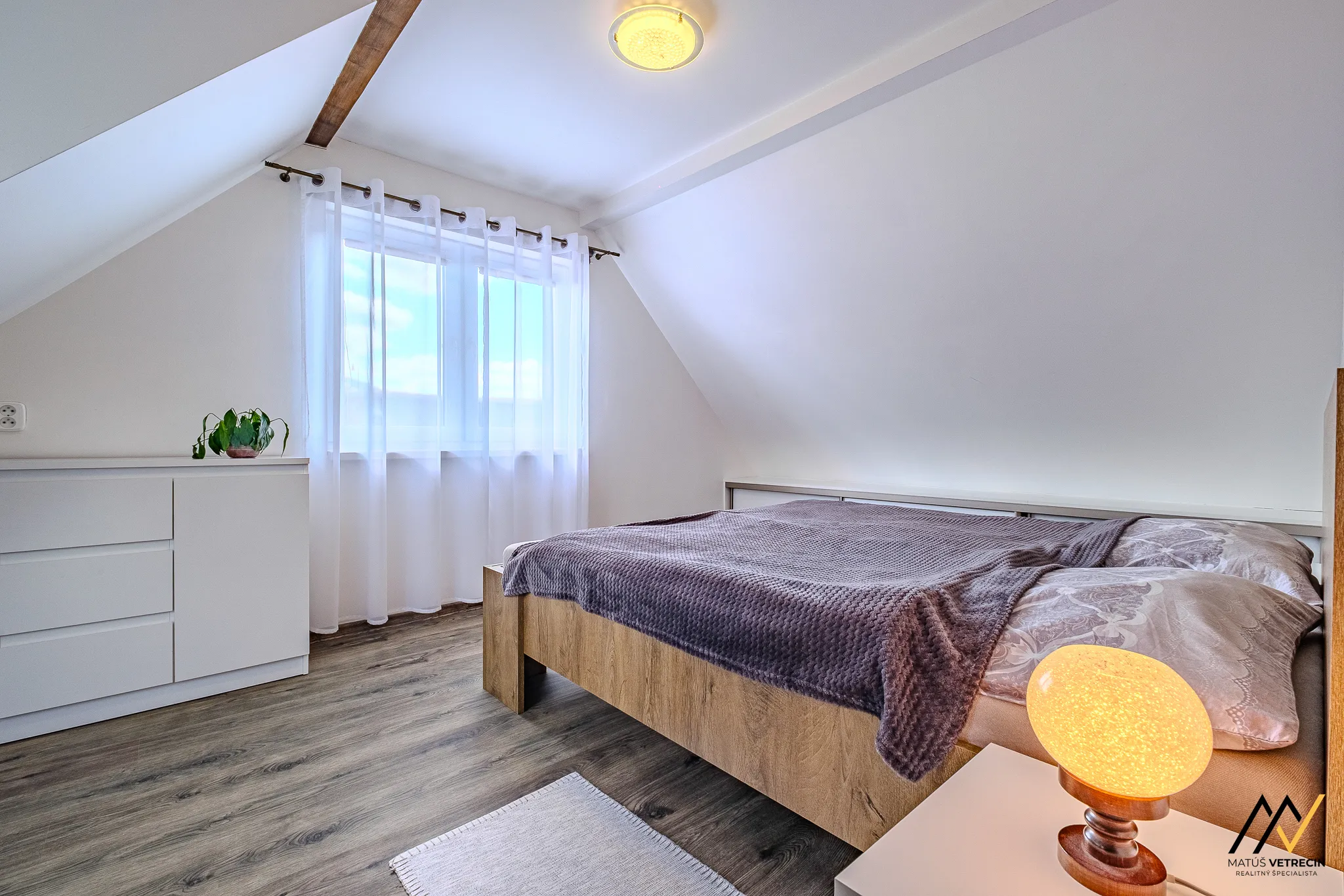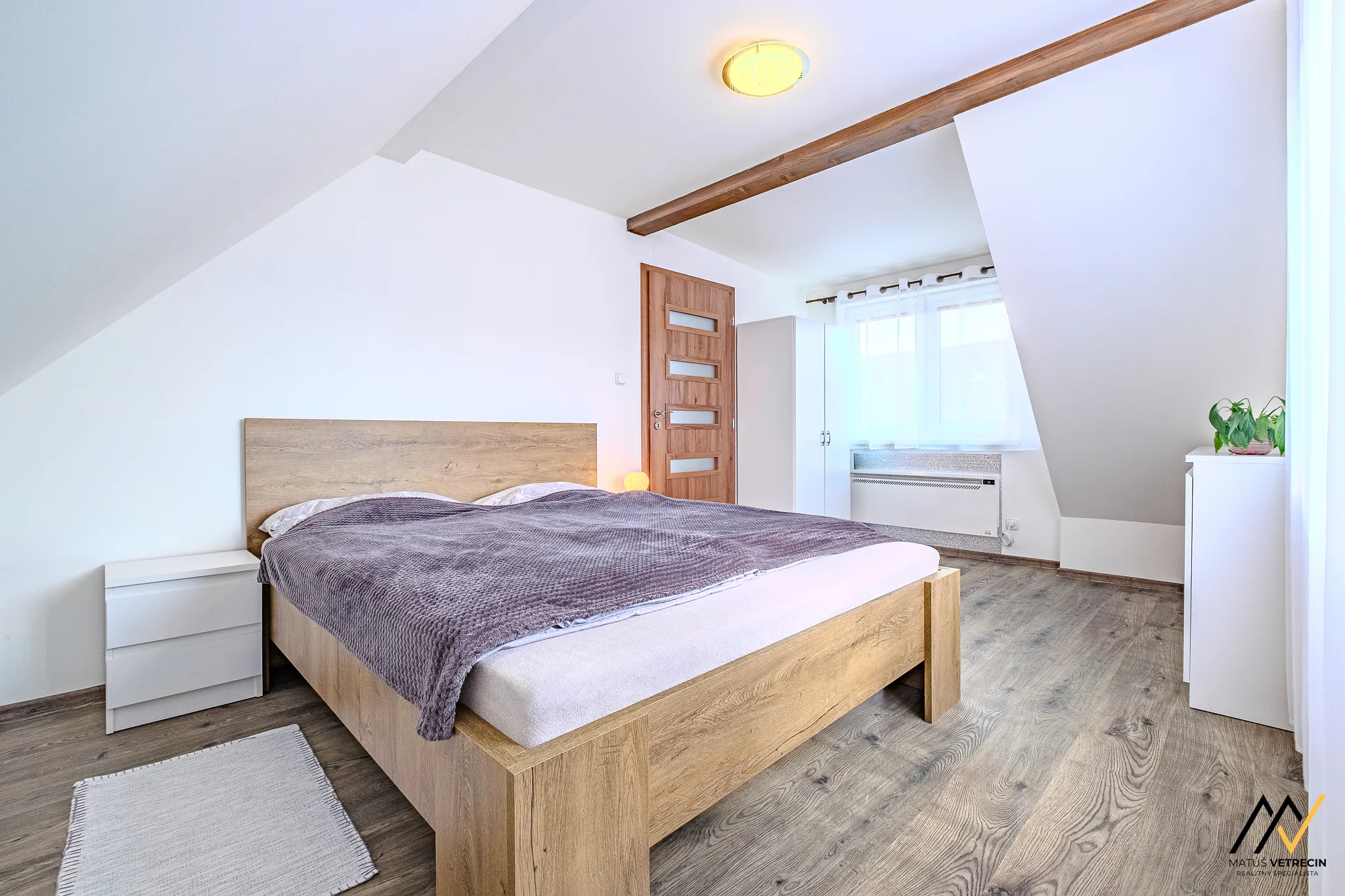 Hlavná spálňa je vzdušná, zaliata jemným svetlom a sľubuje rána, kedy vás namiesto agresívneho budíka zobudí ticho.