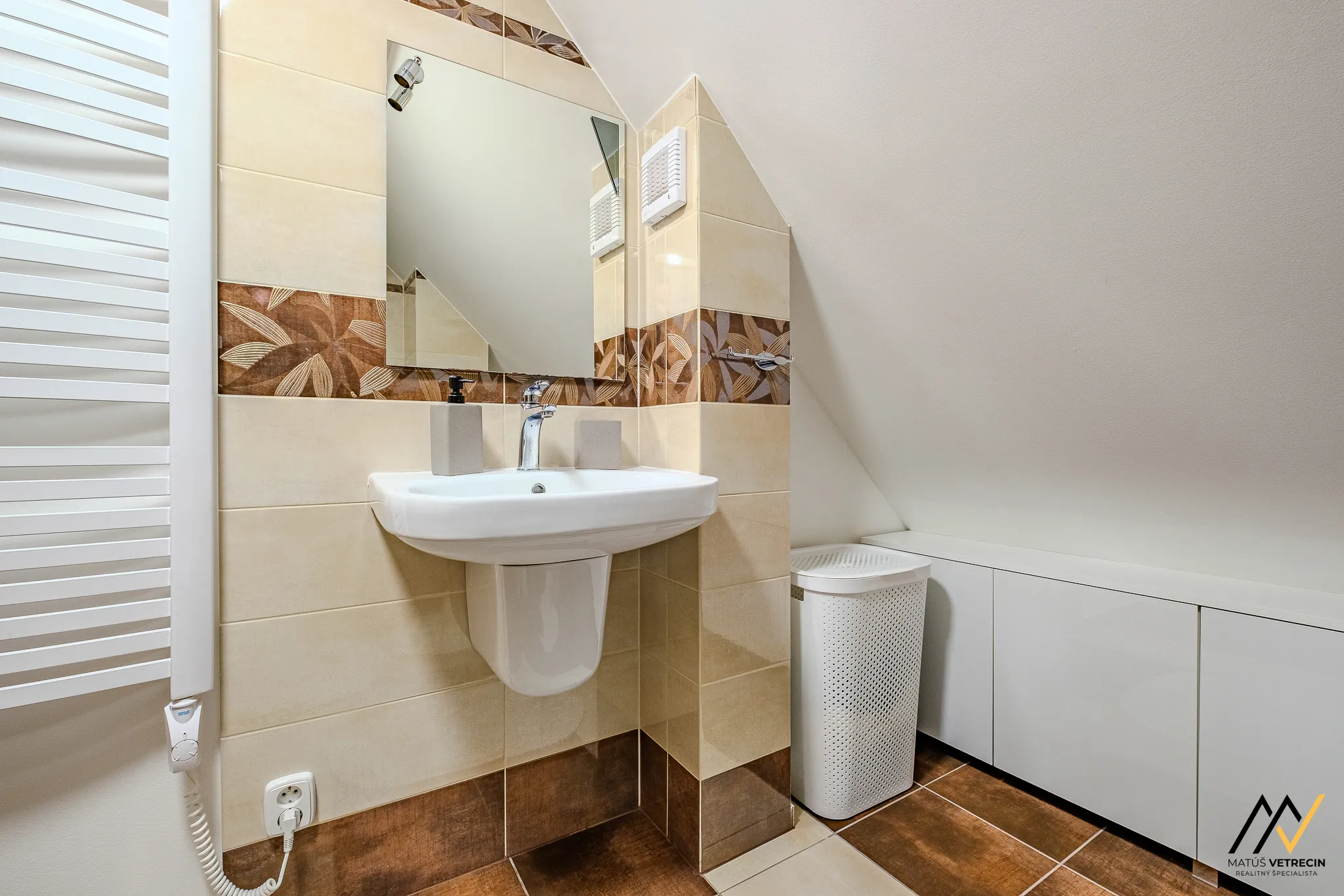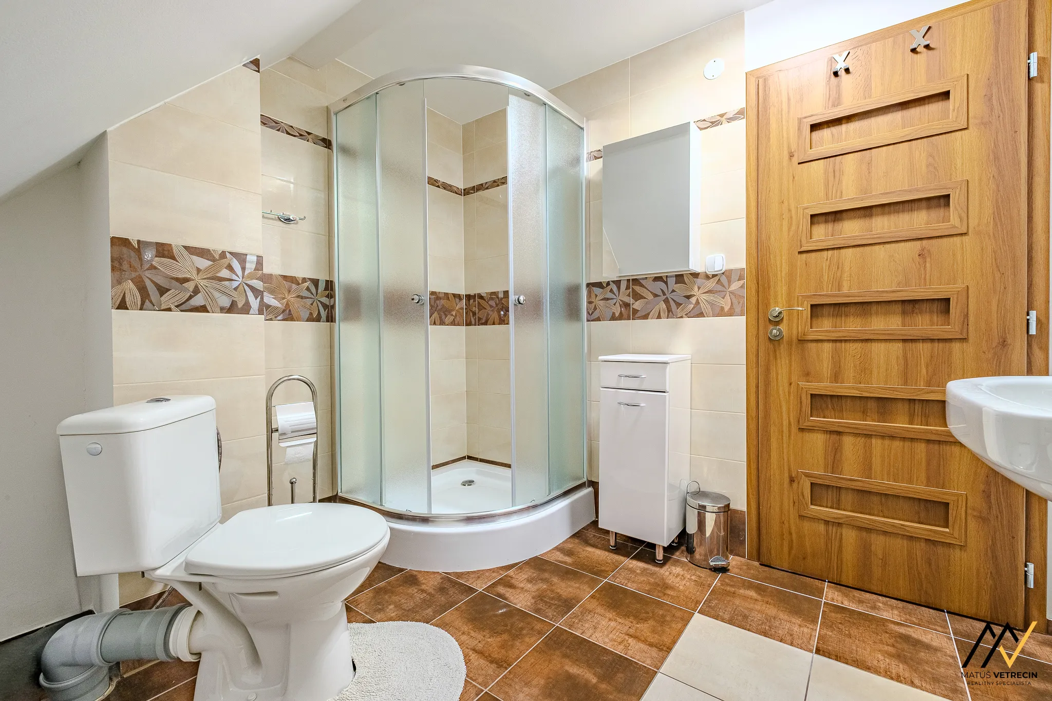 Celé podlažie dopĺňa čistá a funkčná kúpeľňa so sprchovým kútom, kde má každá maličkosť svoje vopred určené miesto.
