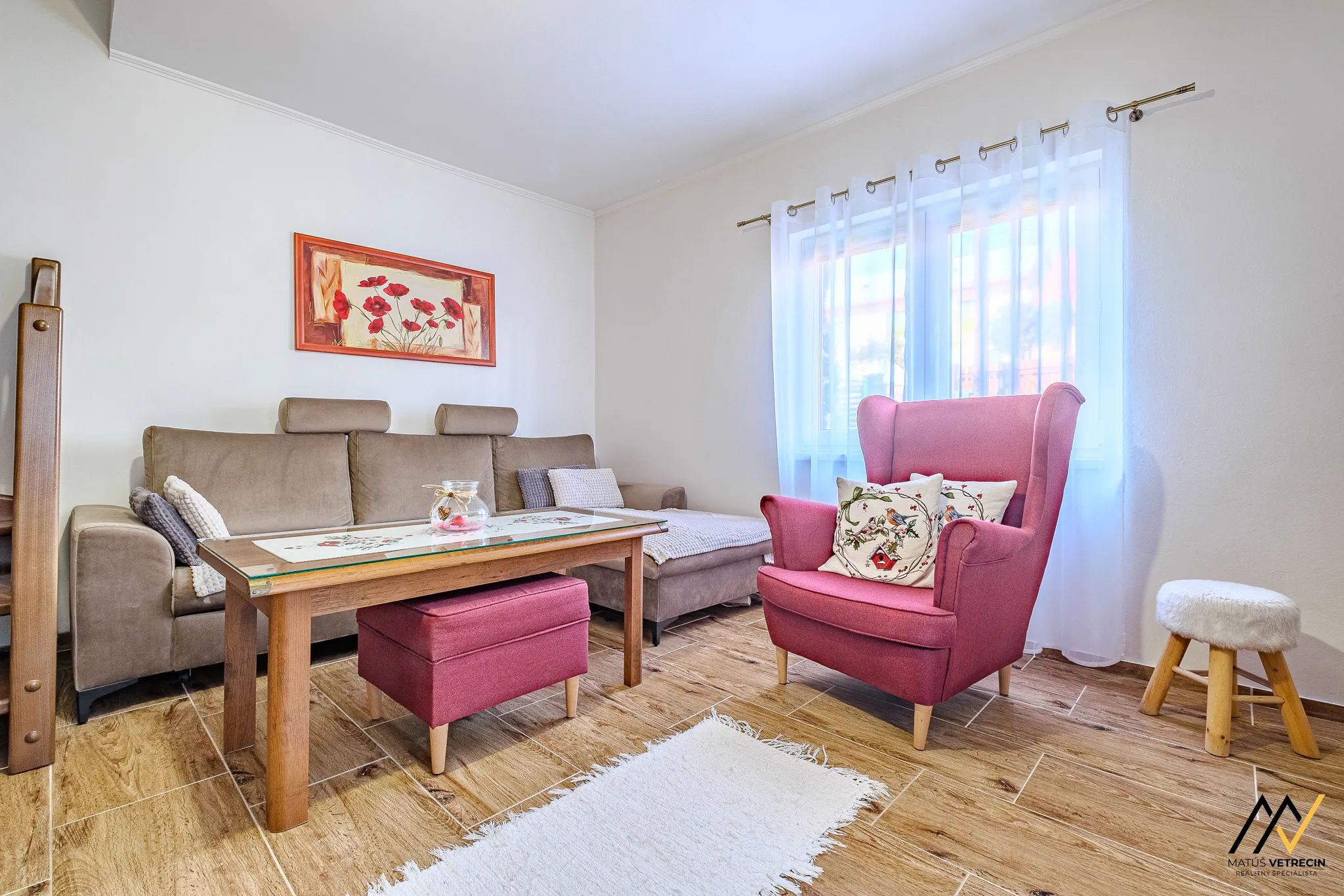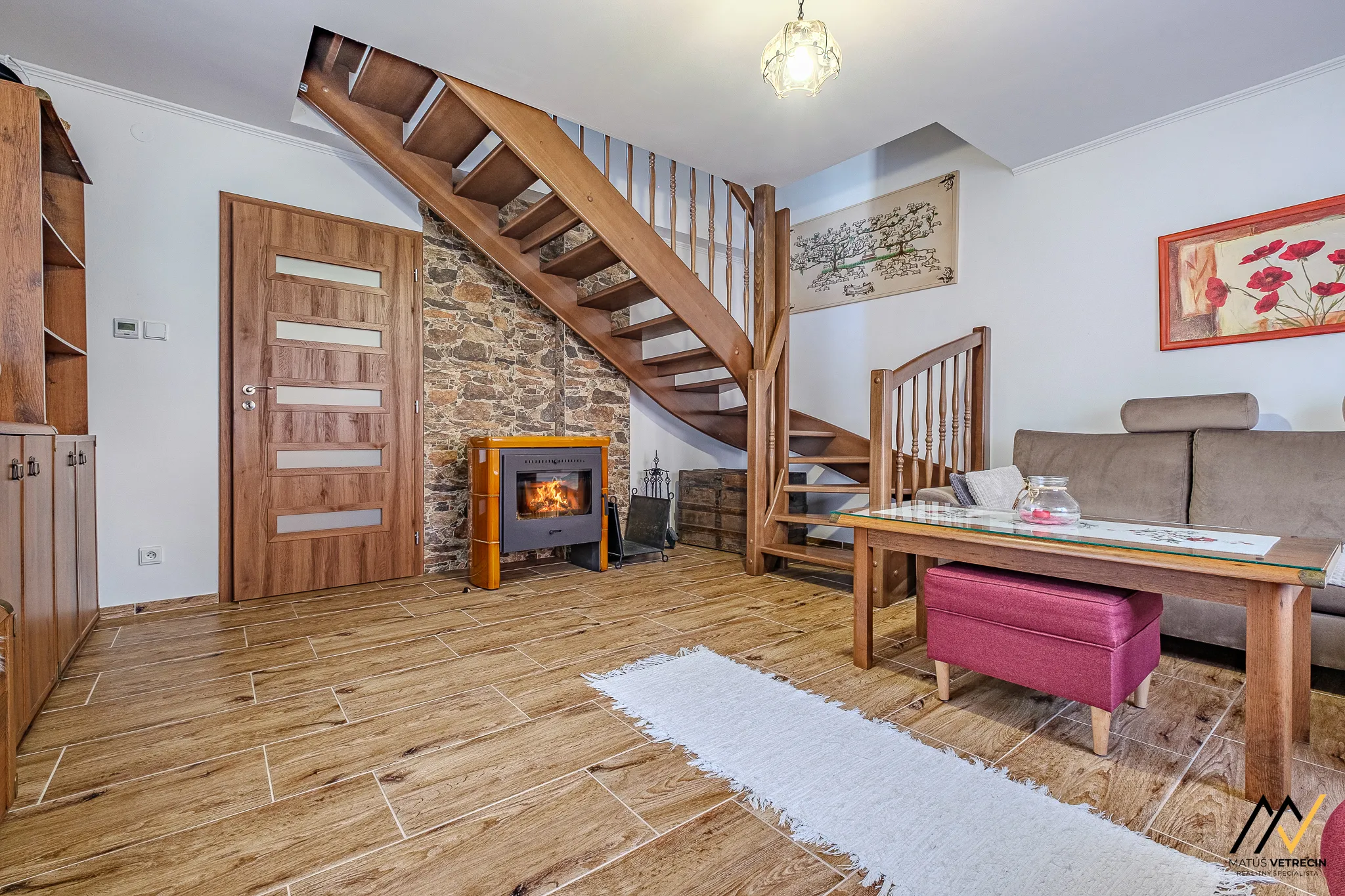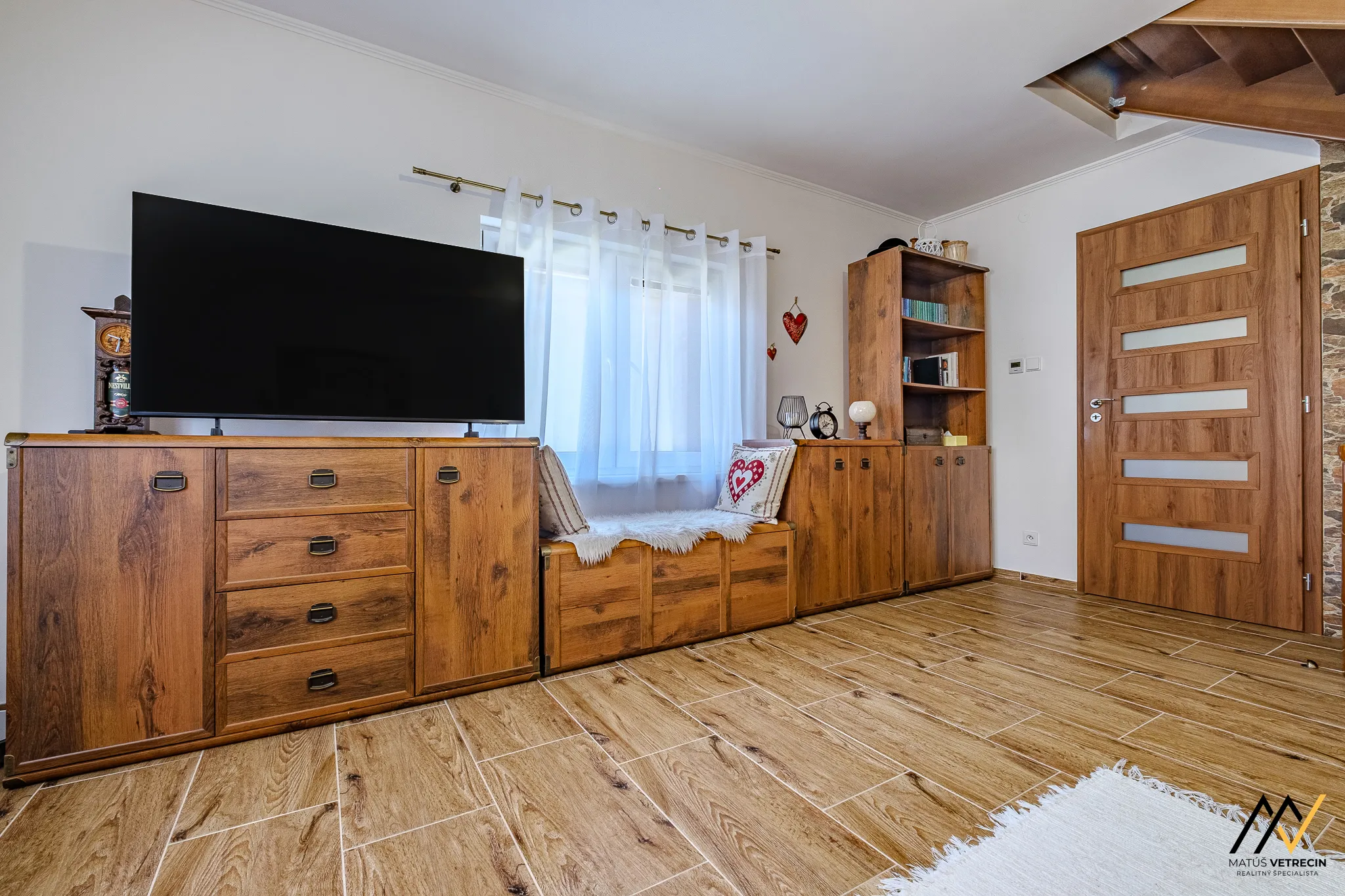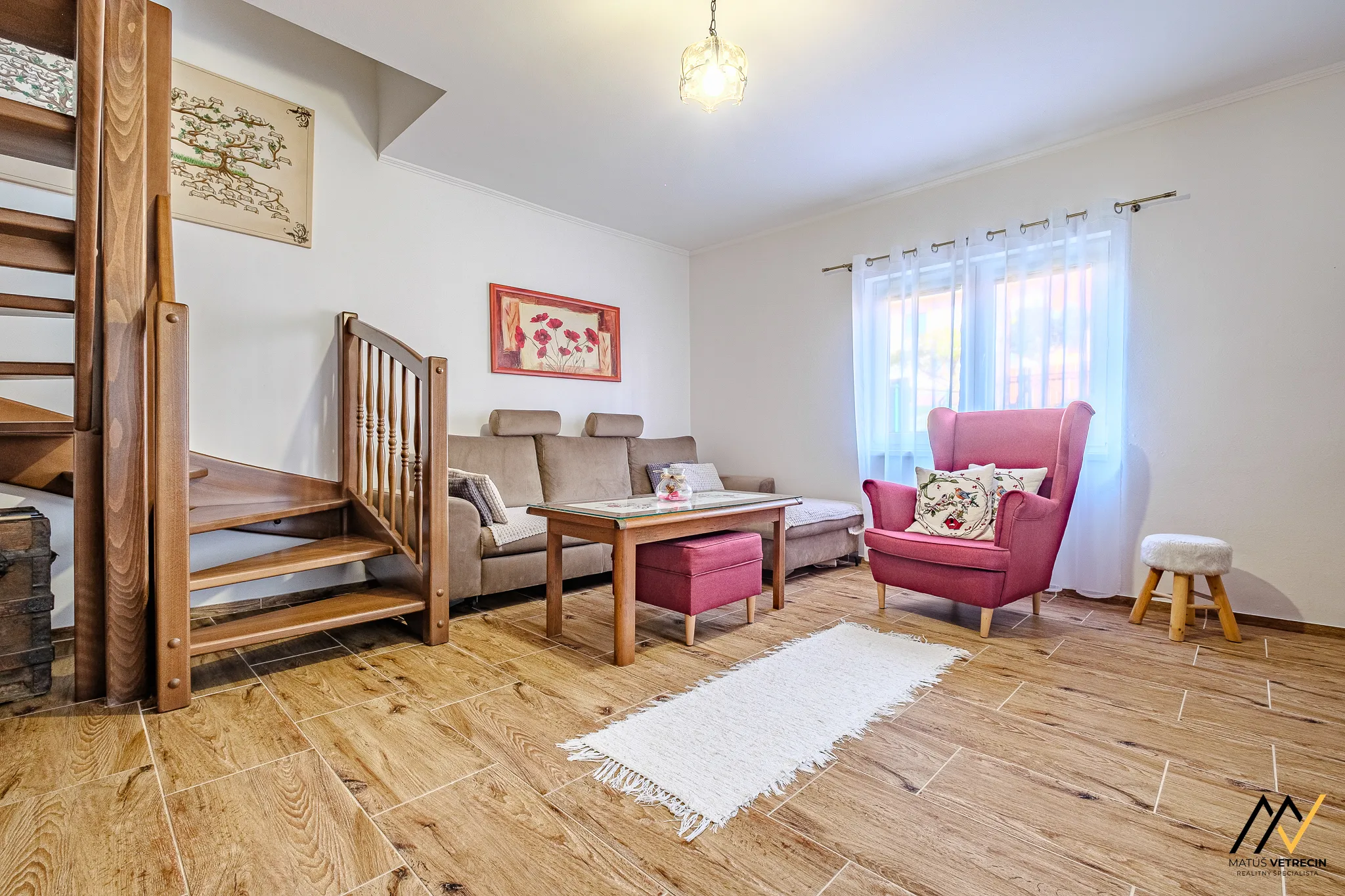 Je to presne ten typ miestnosti, kde sa bežná návšteva zdrží dlhšie, než plánovala, a kde sa zo sedačky môžete kochať pohľadom na masívne drevené schodisko, ktoré spája funkčnosť s poctivým remeslom.
