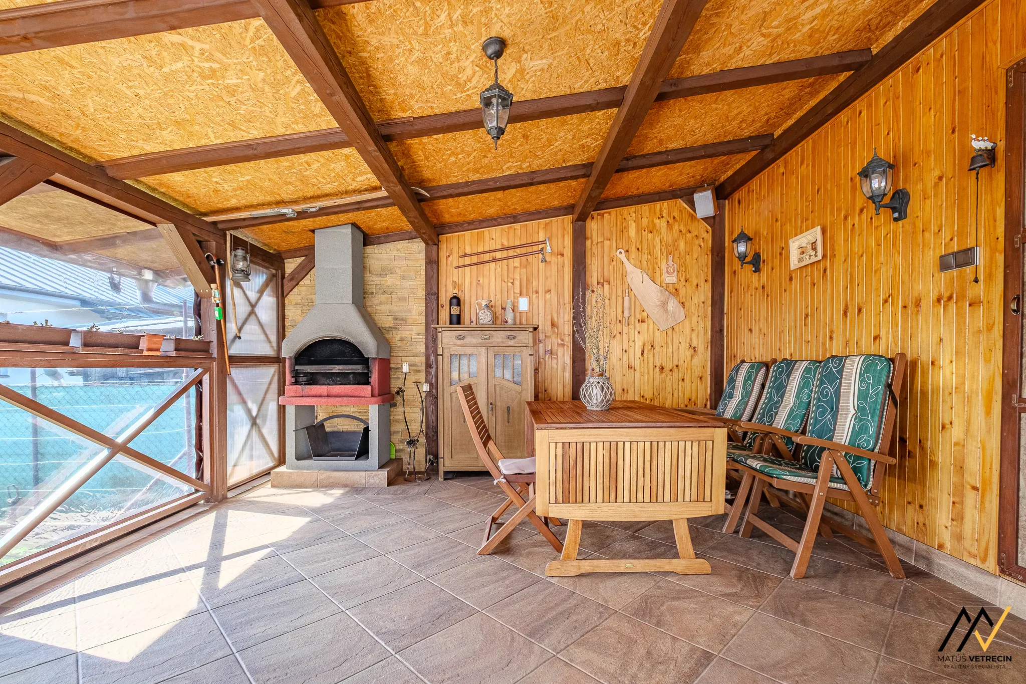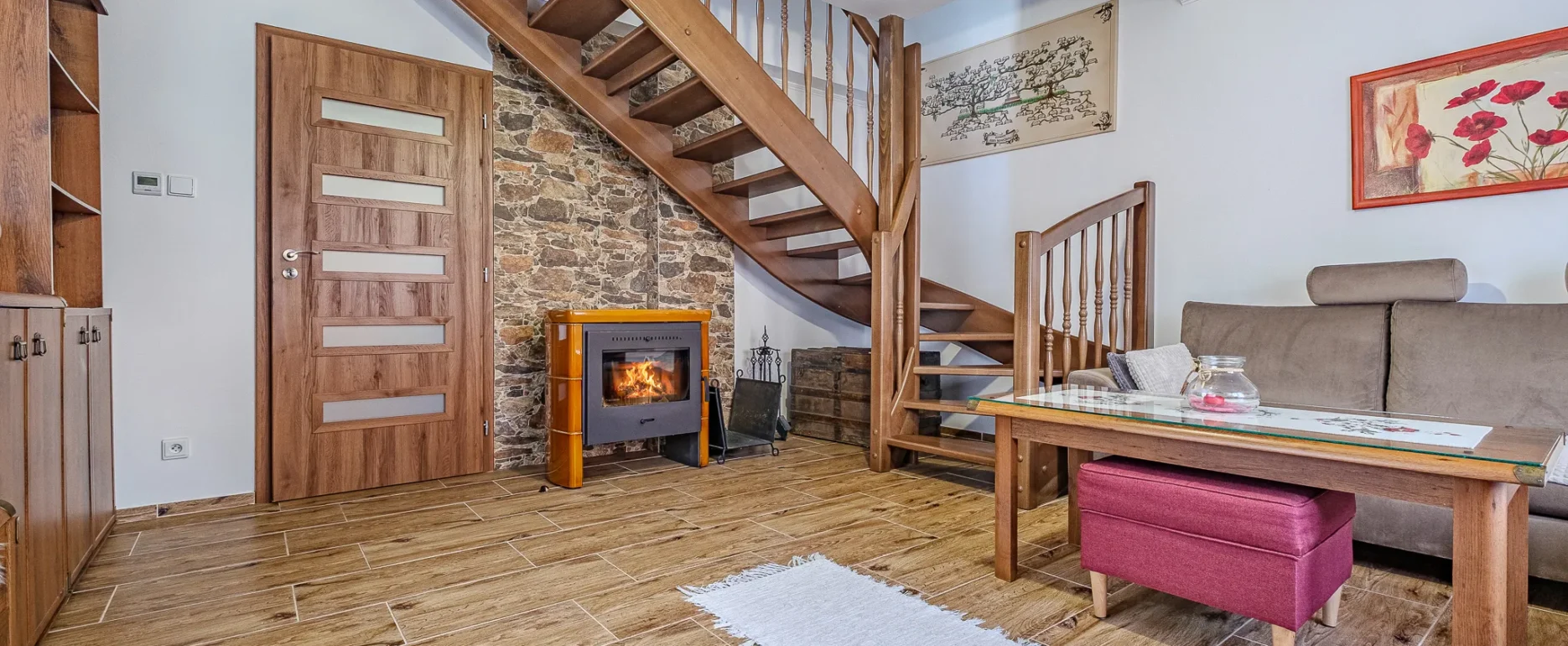 Našu digitálnu obhliadku začneme v obývacej izbe, kde sa prirodzene spomaľuje čas. Dominantou priestoru je krbová piecka citlivo zasadená do kamenného múrika, ktorá tu nie je len ako dekorácia, ale ako skutočné centrum domova. Predstavte si zimný večer, praskanie dreva, pohár vína a rozhovory, ktorých koniec je v nedohľadne.