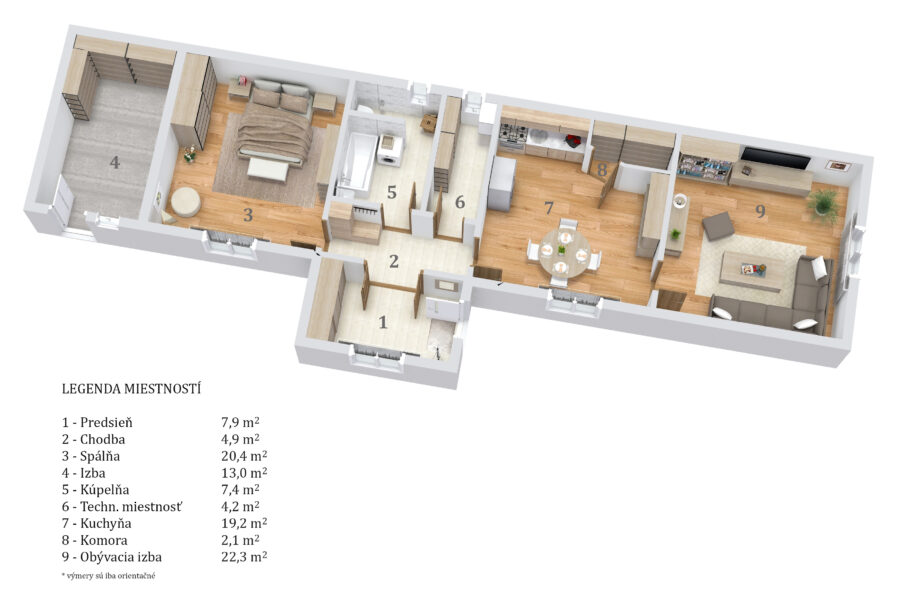 Jedným z najväčších skrytých tromfov tejto nehnuteľnosti je pochôdzne podkrovie. Tento priestor vám dáva možnosť v budúcnosti expandovať a vytvoriť ďalšie obytné metre štvorcové presne podľa vašich potrieb. Aby ste si tento potenciál vedeli lepšie predstaviť, do galérie sme okrem reálnych fotografií zaradili aj vizualizácie interiéru. Tie ukazujú, ako úžasne môže tento dom vyzerať po modernizácii pri zachovaní jeho pôvodnej dispozície.