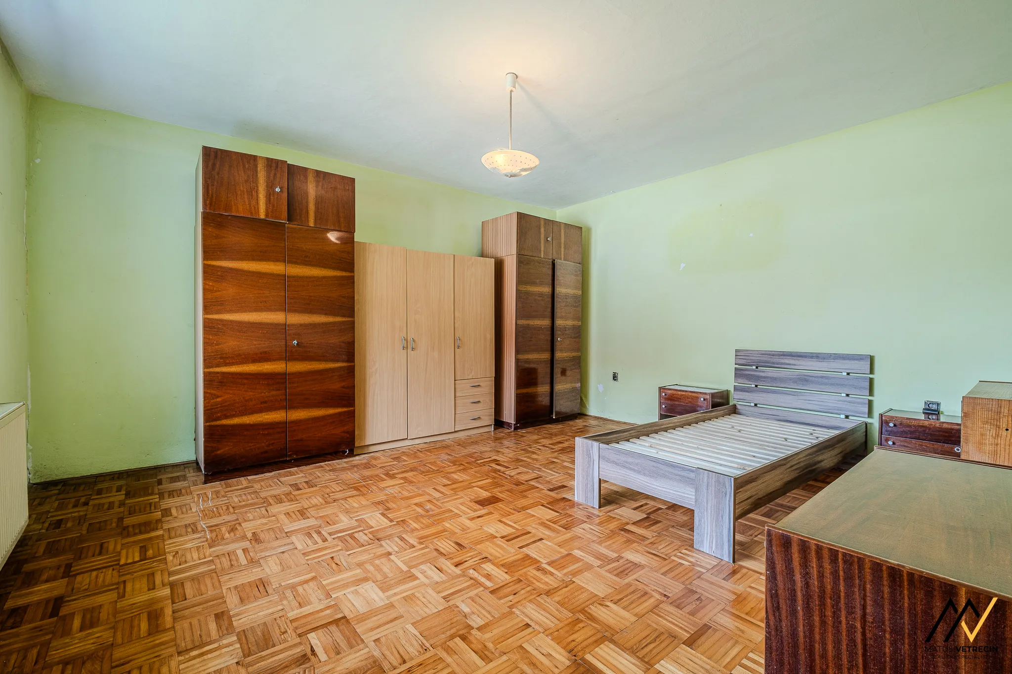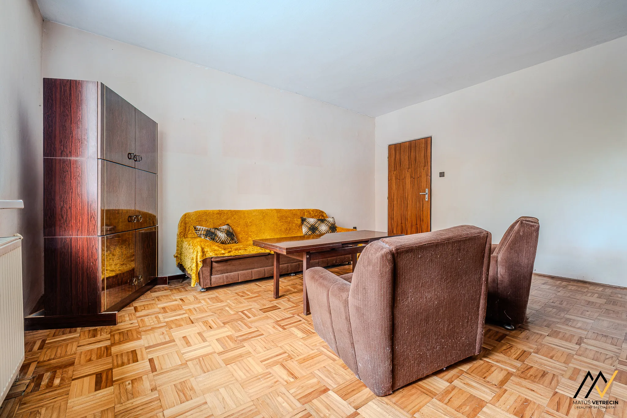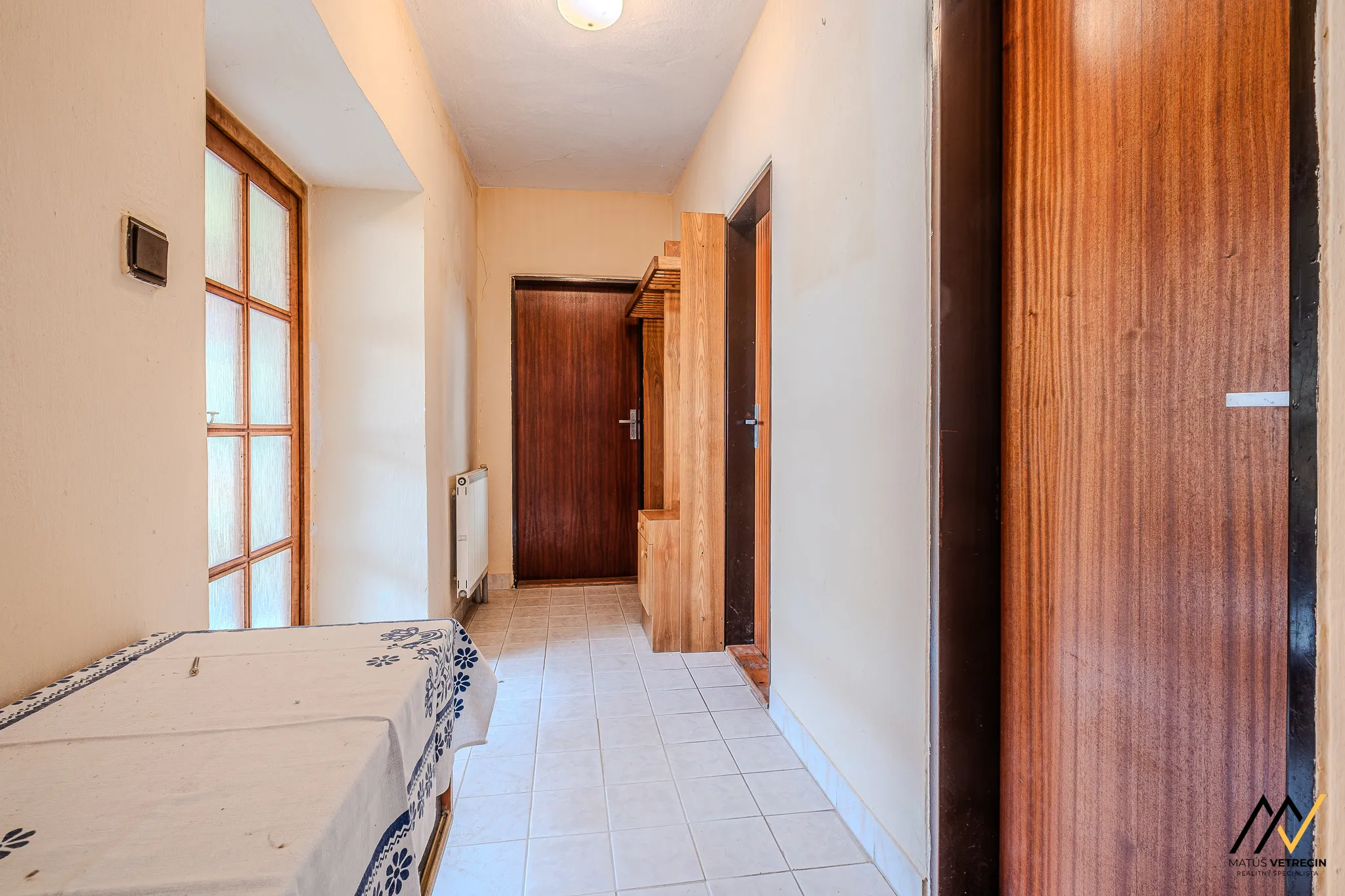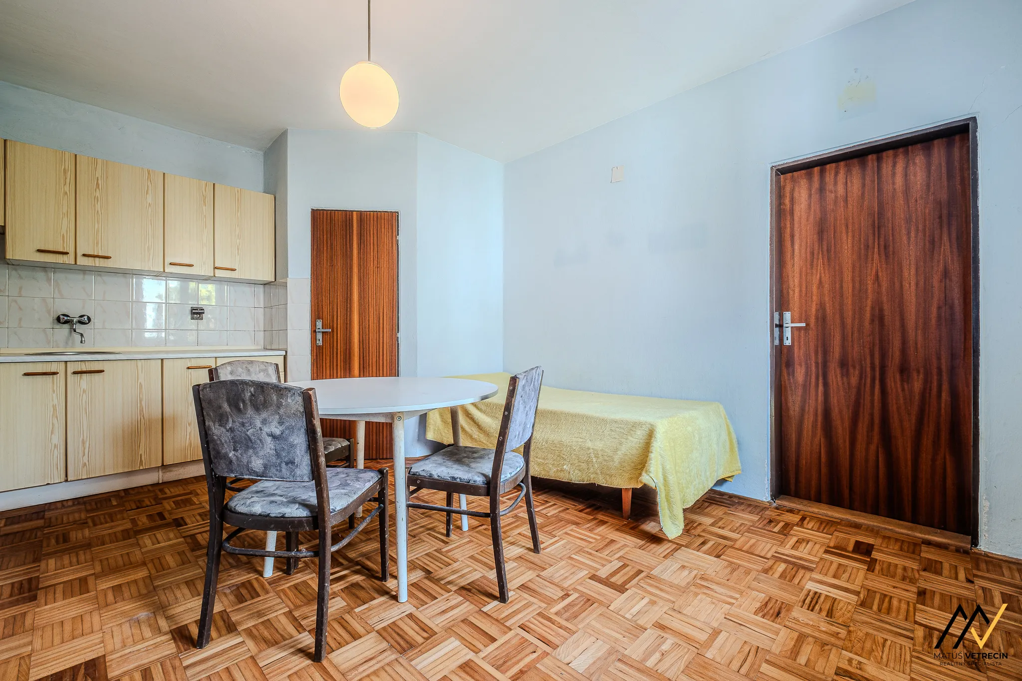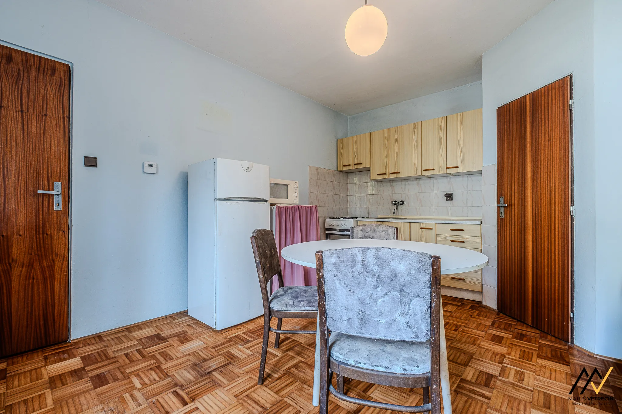 Kuchyňa je prirodzeným východiskovým bodom domu. Hneď za ňou sa nachádza samostatná a priestranná obývacia izba. Toto klasické rozdelenie miestností oceníte najmä vtedy, ak preferujete pokoj pri varení a chcete, aby ruch z kuchyne zostal oddelený od relaxačnej zóny domova. Hoci je interiér v pôvodnom stave, poctivé drevené podlahy v izbách mu dodávajú hrejivú atmosféru a sú ideálnym základom pre vašu budúcu rekonštrukciu. Praktickým doplnkom kuchynskej časti je špajza, ktorú oceníte pri každom väčšom nákupe.